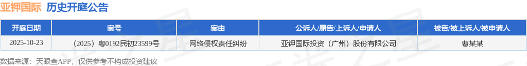 根据统计,近一年内以亚钾国际投资(广州)股份有限公司为当事人的历史开庭公告有1则,其中案由为“网络侵权责任纠纷”的公告以1则居首。历史开庭公告如下: