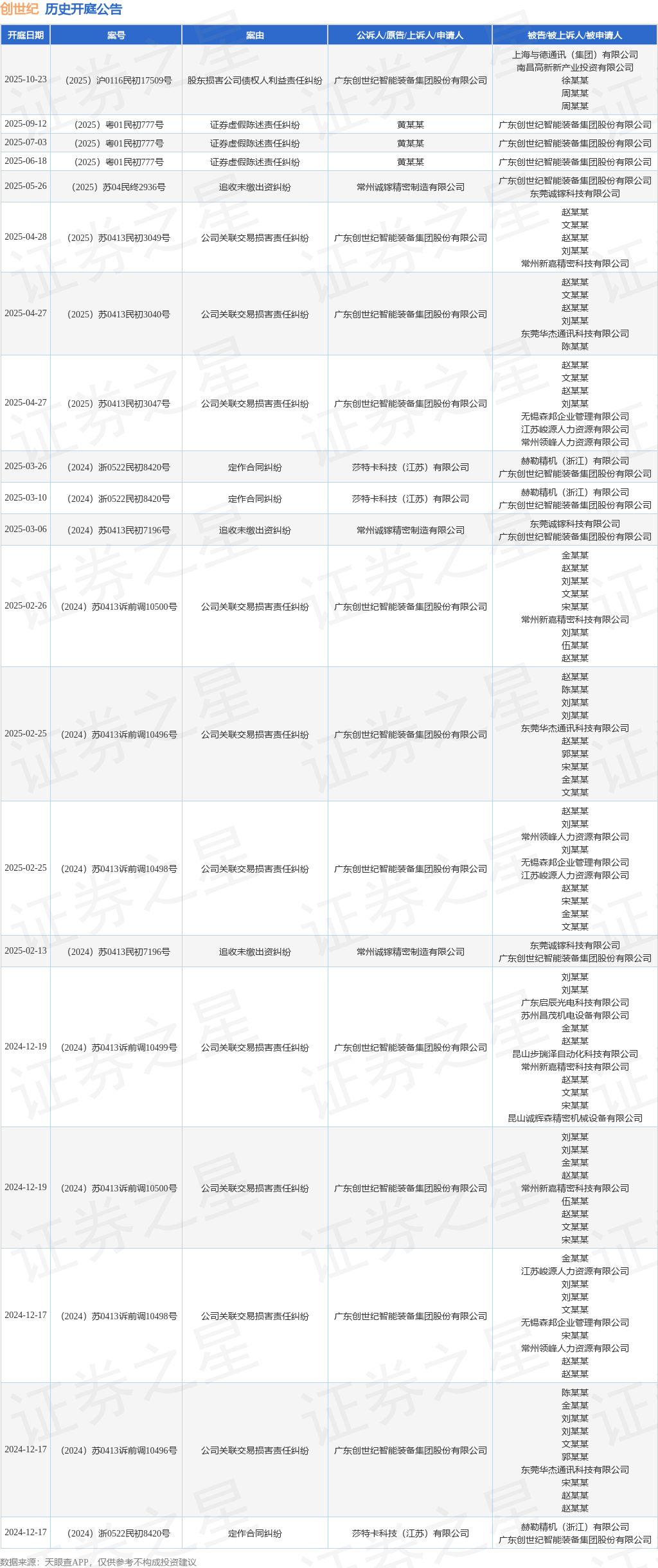 案号:(2025)沪0116民初17509号根据统计,近一年内以广东创世纪智能装备集团股份有限公司为当事人的历史开庭公告有20则,其中案由为“公司关联交易损害责任纠纷”的公告以10则居首,其次为“定作合同纠纷”有3则,“证券虚假陈述责任纠纷”有3则。历史开庭公告如下: