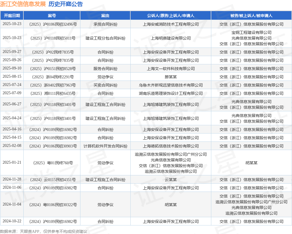 案号:(2025)沪0118民初5011号根据统计,近一年内以交信(浙江)信息发展股份有限公司为当事人的历史开庭公告有18则,其中案由为“合同纠纷”的公告以7则居首,其次为“劳动争议”有3则,“建设工程施工合同纠纷”有3则。历史开庭公告如下: