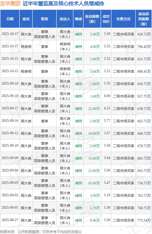 吉华集团近半年内的董监高及核心技术人员增减持详情如下: