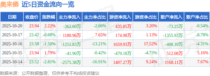 证券之星消息,截至2025年10月20日收盘,奥来德(688378)报收于23.94元,上涨2.22%,换手率2.35%,成交量5.65万手,成交额1.36亿元。