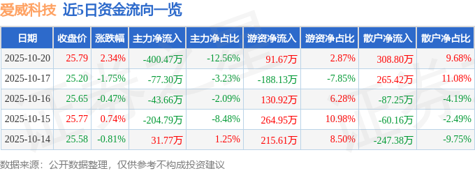 10月20日的资金流向数据方面,主力资金净流出400.47万元,占总成交额12.56%,游资资金净流入91.67万元,占总成交额2.87%,散户资金净流入308.8万元,占总成交额9.68%。
