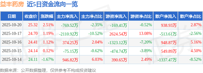 证券之星消息,截至2025年10月20日收盘,益丰药房(603939)报收于25.32元,上涨2.51%,换手率1.07%,成交量13.0万手,成交额3.27亿元。