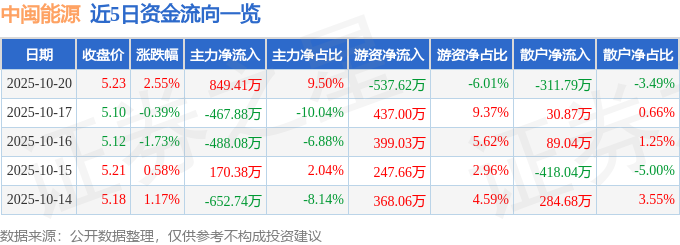 证券之星消息,截至2025年10月20日收盘,中闽能源(600163)报收于5.23元,上涨2.55%,换手率0.9%,成交量17.2万手,成交额8941.07万元。