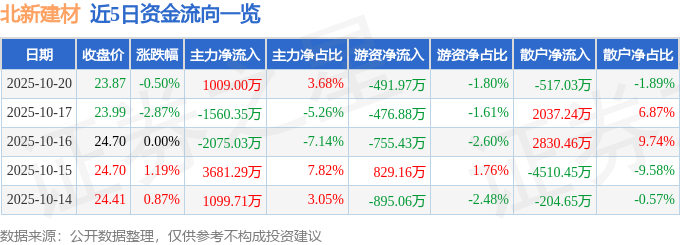 证券之星消息,截至2025年10月20日收盘,北新建材(000786)报收于23.87元,下跌0.5%,换手率0.7%,成交量11.5万手,成交额2.74亿元。