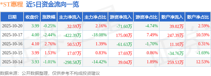 证券之星消息,截至2025年10月20日收盘,*ST惠程(002168)报收于3.99元,下跌0.25%,换手率0.48%,成交量3.77万手,成交额1509.03万元。