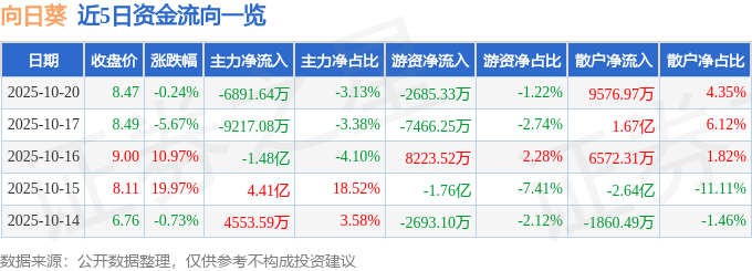 证券之星消息,截至2025年10月20日收盘,向日葵(300111)报收于8.47元,下跌0.24%,换手率19.71%,成交量253.71万手,成交额22.03亿元。