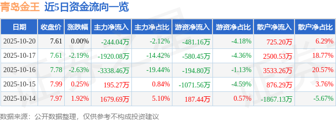 证券之星消息,截至2025年10月20日收盘,青岛金王(002094)报收于7.61元,上涨0.0%,换手率2.2%,成交量15.16万手,成交额1.15亿元。