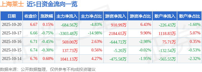 证券之星消息,截至2025年10月20日收盘,上海莱士(002252)报收于6.67元,上涨0.15%,换手率0.32%,成交量21.27万手,成交额1.42亿元。