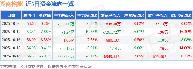 证券之星消息,截至2025年10月20日收盘,湖南裕能(301358)报收于53.65元,上涨0.26%,换手率4.94%,成交量19.08万手,成交额10.38亿元。