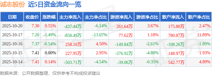 10月20日的资金流向数据方面,主力资金净流出437.44万元,占总成交额6.14%,游资资金净流入261.64万元,占总成交额3.67%,散户资金净流入175.8万元,占总成交额2.47%。