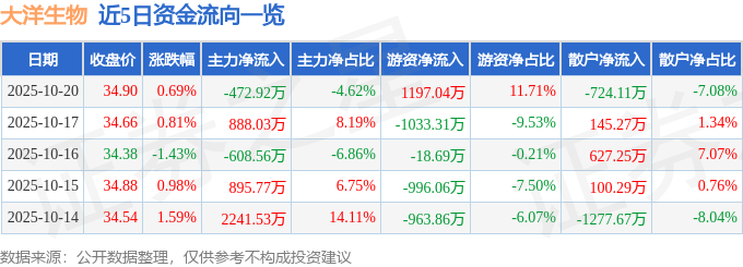 证券之星消息,截至2025年10月20日收盘,大洋生物(003017)报收于34.9元,上涨0.69%,换手率4.23%,成交量2.93万手,成交额1.02亿元。
