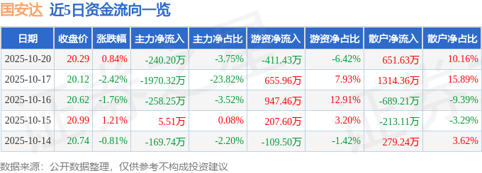 证券之星消息,截至2025年10月20日收盘,国安达(300902)报收于20.29元,上涨0.84%,换手率2.62%,成交量3.18万手,成交额6413.43万元。