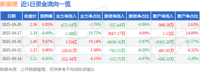 证券之星消息,截至2025年10月20日收盘,新里程(002219)报收于2.36元,上涨0.85%,换手率4.94%,成交量161.5万手,成交额3.8亿元。