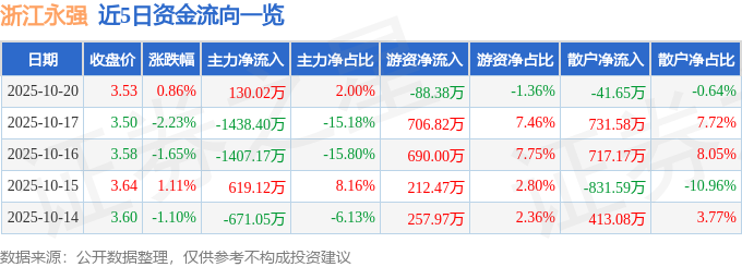 证券之星消息,截至2025年10月20日收盘,浙江永强(002489)报收于3.53元,上涨0.86%,换手率0.96%,成交量18.39万手,成交额6496.27万元。
