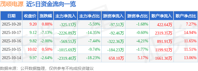 证券之星消息,截至2025年10月20日收盘,茂硕电源(002660)报收于9.2元,上涨0.88%,换手率1.85%,成交量6.34万手,成交额5812.22万元。