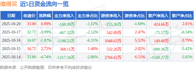 证券之星消息,截至2025年10月20日收盘,值得买(300785)报收于33.0元,上涨0.89%,换手率3.73%,成交量4.56万手,成交额1.51亿元。