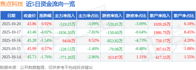 证券之星消息,截至2025年10月20日收盘,焦点科技(002315)报收于43.86元,上涨0.92%,换手率1.89%,成交量3.83万手,成交额1.68亿元。