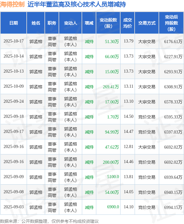 海得控制近半年内的董监高及核心技术人员增减持详情如下: