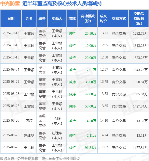 中光防雷近半年内的董监高及核心技术人员增减持详情如下: