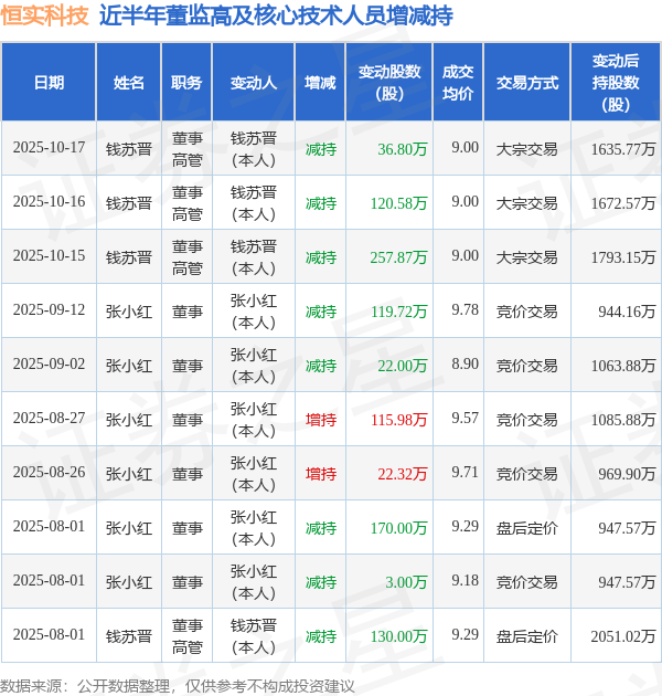 恒实科技近半年内的董监高及核心技术人员增减持详情如下: