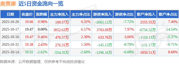 10月20日的资金流向数据方面,主力资金净流入109.57万元,占总成交额0.32%,游资资金净流出2665.12万元,占总成交额7.72%,散户资金净流入2555.55万元,占总成交额7.4%。