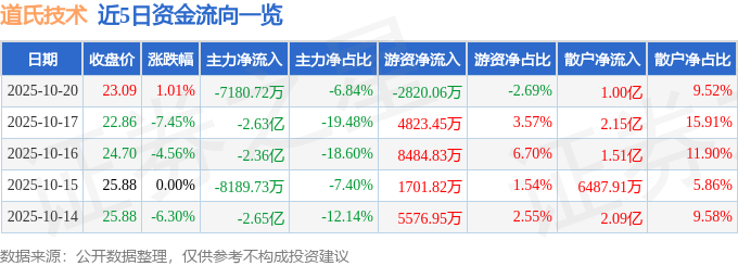 证券之星消息,截至2025年10月20日收盘,道氏技术(300409)报收于23.09元,上涨1.01%,换手率6.55%,成交量45.04万手,成交额10.5亿元。