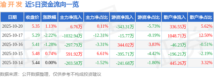 证券之星消息,截至2025年10月20日收盘,渝 开 发(000514)报收于5.35元,上涨1.13%,换手率1.33%,成交量11.19万手,成交额5987.91万元。