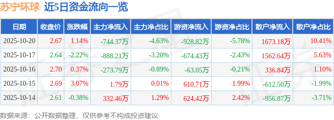 证券之星消息,截至2025年10月20日收盘,苏宁环球(000718)报收于2.67元,上涨1.14%,换手率2.65%,成交量60.51万手,成交额1.61亿元。