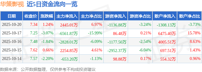 证券之星消息,截至2025年10月20日收盘,华策影视(300133)报收于7.34元,上涨1.24%,换手率2.94%,成交量47.7万手,成交额3.51亿元。