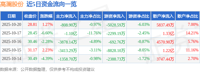 证券之星消息,截至2025年10月20日收盘,高澜股份(300499)报收于28.81元,上涨1.27%,换手率10.55%,成交量28.63万手,成交额8.34亿元。