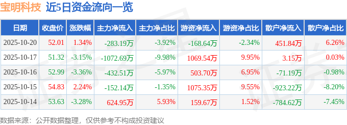 10月20日的资金流向数据方面,主力资金净流出283.19万元,占总成交额3.92%,游资资金净流出168.64万元,占总成交额2.34%,散户资金净流入451.84万元,占总成交额6.26%。