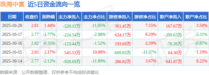 证券之星消息,截至2025年10月20日收盘,珠海中富(000659)报收于2.81元,上涨1.44%,换手率1.33%,成交量17.14万手,成交额4787.28万元。
