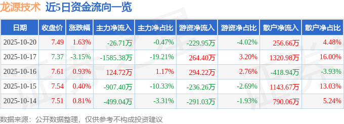 证券之星消息,截至2025年10月20日收盘,龙源技术(300105)报收于7.49元,上涨1.63%,换手率1.49%,成交量7.68万手,成交额5726.95万元。