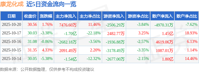 10月20日的资金流向数据方面,主力资金净流入7476.6万元,占总成交额11.46%,游资资金净流出2506.29万元,占总成交额3.84%,散户资金净流出4970.31万元,占总成交额7.62%。