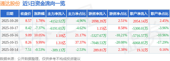 证券之星消息,截至2025年10月20日收盘,通达股份(002560)报收于8.57元,上涨1.78%,换手率21.65%,成交量98.05万手,成交额8.37亿元。