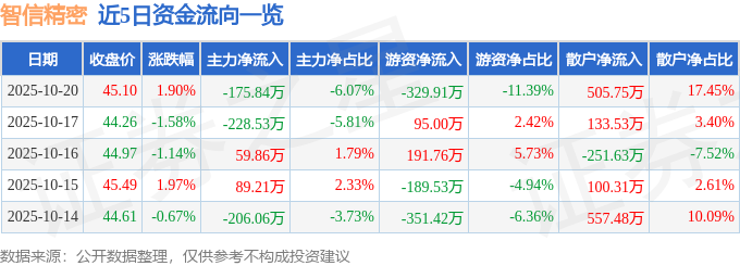 证券之星消息,截至2025年10月20日收盘,智信精密(301512)报收于45.1元,上涨1.9%,换手率2.59%,成交量6434.0手,成交额2897.47万元。