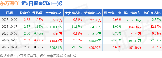 证券之星消息,截至2025年10月20日收盘,东方海洋(002086)报收于2.62元,上涨1.95%,换手率2.97%,成交量47.0万手,成交额1.21亿元。