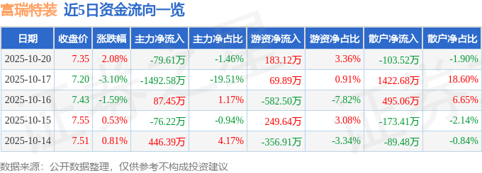 证券之星消息,截至2025年10月20日收盘,富瑞特装(300228)报收于7.35元,上涨2.08%,换手率1.36%,成交量7.47万手,成交额5445.91万元。