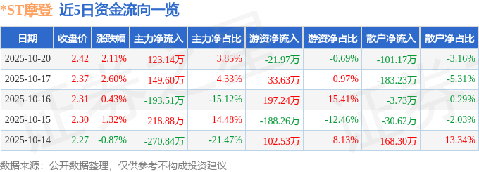 证券之星消息,截至2025年10月20日收盘,*ST摩登(002656)报收于2.42元,上涨2.11%,换手率1.97%,成交量13.32万手,成交额3196.85万元。