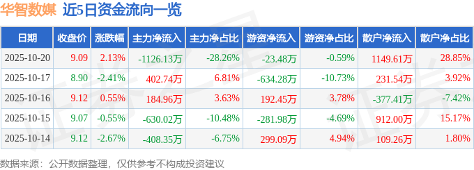 证券之星消息,截至2025年10月20日收盘,华智数媒(300426)报收于9.09元,上涨2.13%,换手率1.1%,成交量4.41万手,成交额3985.47万元。