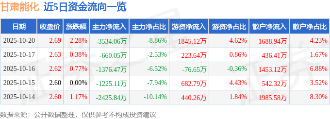 证券之星消息,截至2025年10月20日收盘,甘肃能化(000552)报收于2.69元,上涨2.28%,换手率4.02%,成交量149.87万手,成交额3.99亿元。