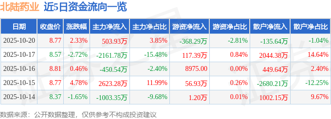 证券之星消息,截至2025年10月20日收盘,北陆药业(300016)报收于8.77元,上涨2.33%,换手率2.67%,成交量15.01万手,成交额1.31亿元。