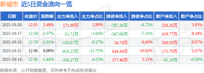 证券之星消息,截至2025年10月20日收盘,新城市(300778)报收于12.81元,上涨2.48%,换手率2.28%,成交量4.64万手,成交额5914.36万元。