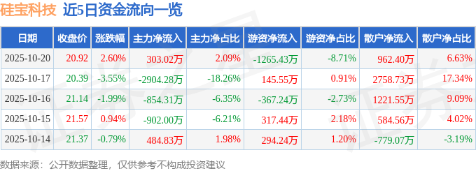 证券之星消息,截至2025年10月20日收盘,硅宝科技(300019)报收于20.92元,上涨2.6%,换手率2.06%,成交量6.95万手,成交额1.45亿元。