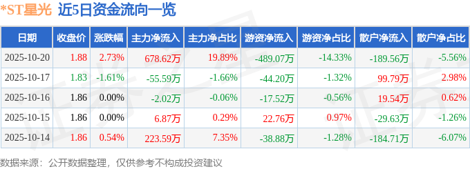 证券之星消息,截至2025年10月20日收盘,*ST星光(002076)报收于1.88元,上涨2.73%,换手率1.76%,成交量18.34万手,成交额3411.97万元。