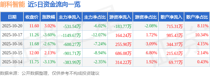 证券之星消息,截至2025年10月20日收盘,朗科智能(300543)报收于11.6元,上涨3.02%,换手率3.06%,成交量7.65万手,成交额8823.71万元。