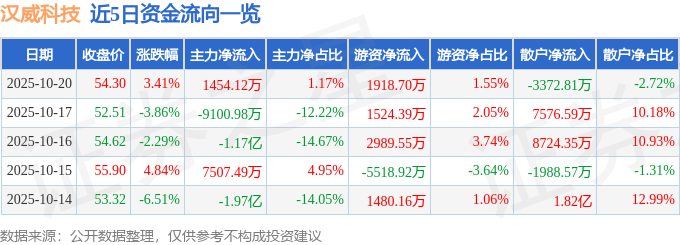 10月20日的资金流向数据方面,主力资金净流入1454.12万元,占总成交额1.17%,游资资金净流入1918.7万元,占总成交额1.55%,散户资金净流出3372.81万元,占总成交额2.72%。