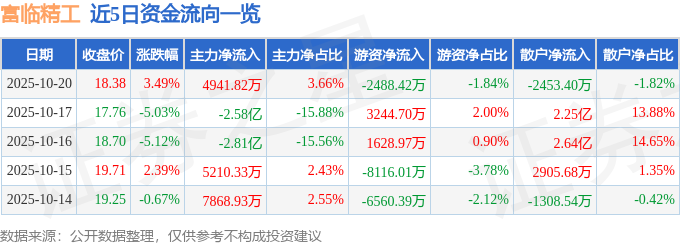 证券之星消息,截至2025年10月20日收盘,富临精工(300432)报收于18.38元,上涨3.49%,换手率4.34%,成交量73.41万手,成交额13.49亿元。