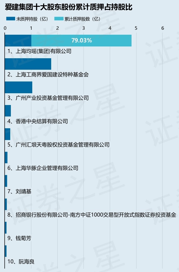 截止本公告日,股东上海均瑶(集团)有限公司已累计质押股份3.82亿股,占其持股总数的79.03%。本次质押后爱建集团十大股东的累计质押股份占持股比例(占持股比例的计算以公司最新一期财务报表公布的十大股东的持股总数为基准)见下图: